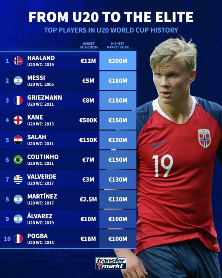 1.哈兰德(2019年参加U20世界杯):1200万欧元(参加U20世界杯时的身价)→2亿欧元(生涯迄今最高身价)